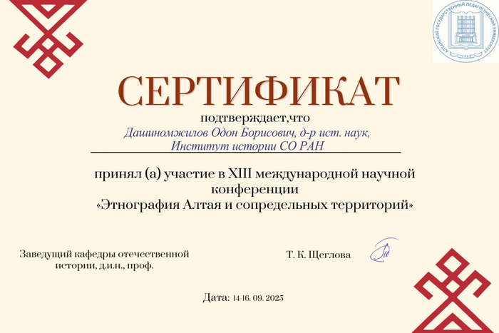 Cотрудник Института истории СО РАН О.Б. Дашинамжилов выступил с докладом на XIII Международной научной конференции «Этнография Алтая и сопредельных территорий», посвященной 80-летию Великой Победы и Году защитника Отечества