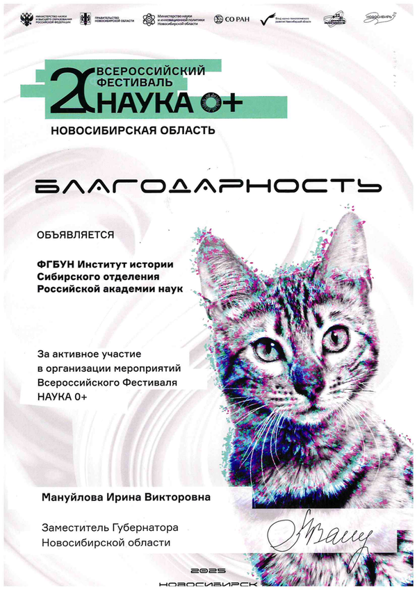 Коллектив Института истории СО РАН получил благодарность от правительства Новосибирской области за проведении Всероссийского фестиваля NAUKA 0+ в 2025 году