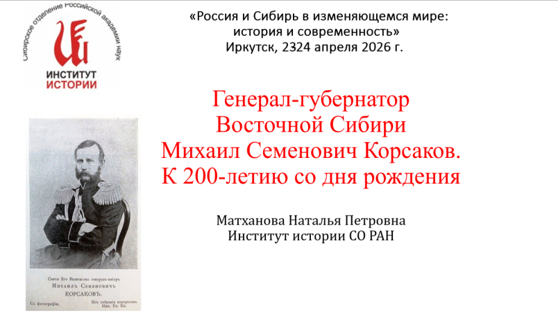 Главный научный сотрудник Института истории СО РАН, доктор исторических наук Наталья Петровна Матханова выступила на пленарном заседании с докладом «Генерал-губернатор Восточной Сибири Михаил Семенович Корсаков. К 200-летию со дня рождения». Были рассмотрены основные направления его деятельности, проанализированы успехи и неудачи высокопоставленного администратора, показано значение его достижений для региона и страны в целом.